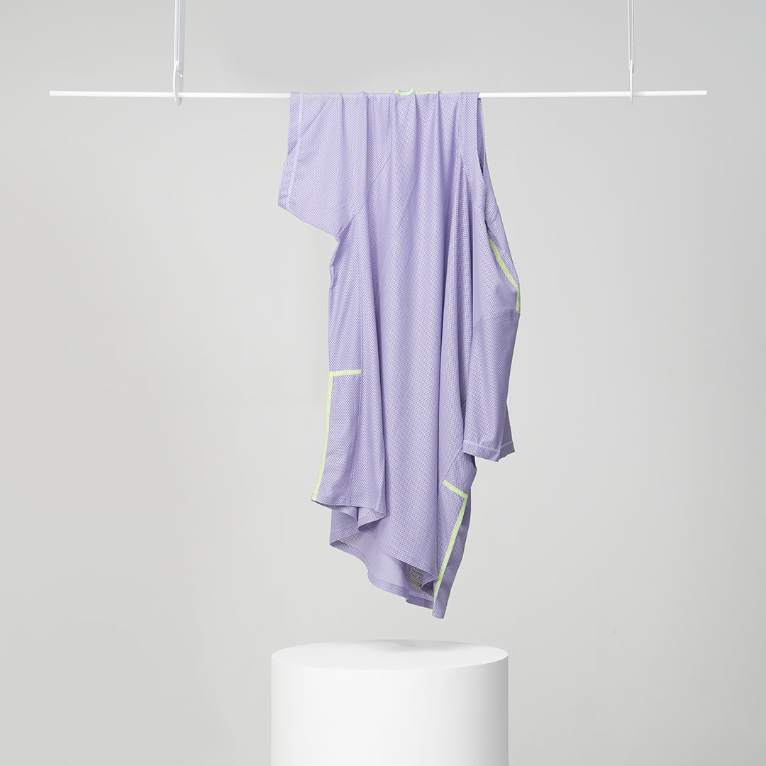 In our case, we sublimated both sides of our micro mesh fabric in our chosen colours, lilac, black and our latest sage green. By printing the colour on rather than dyeing the fabric, this eliminated the sheerness whilst maintaining all the existing properties. As a result, we achieved our 100g t-shirt.