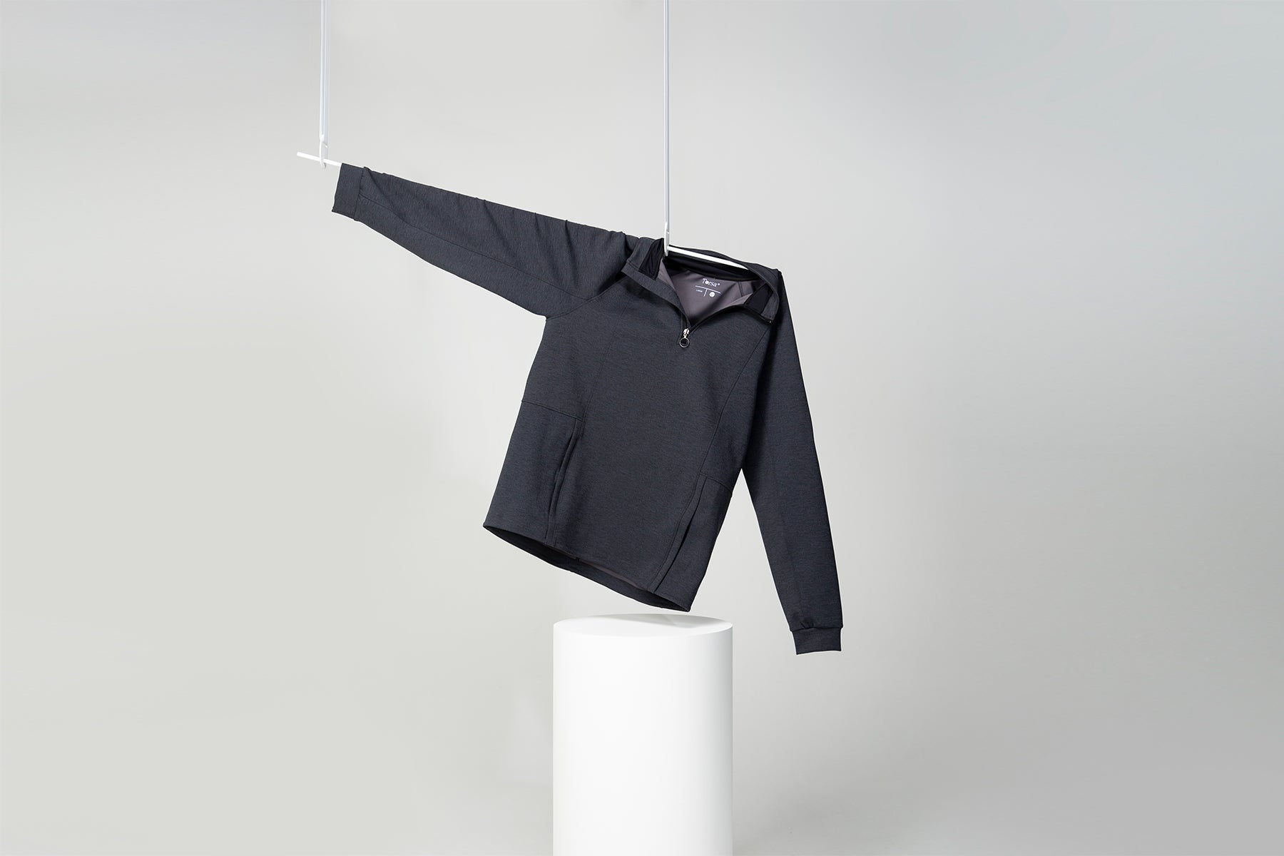The half zip sweatshirt design elements include signature O-ring zipper, a subtle nod to our brand identity. We also added our T-stitch on the reverse using a durable flatlock thread from premium thread supplier Gutermann. We included heat bonded seams at the hem, and bonded neck guard to reduce bulk and maximise comfort.